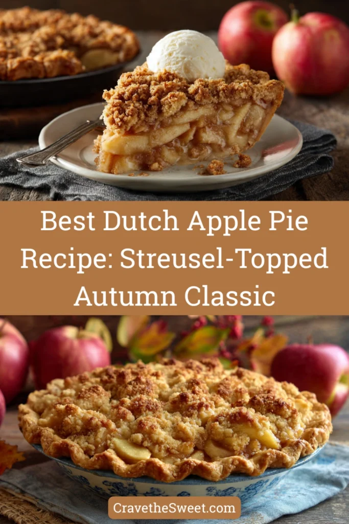 Dutch apple pie is a traditional apple pie featuring a streusel or crumb topping instead of a pastry top crust, with the thick, sweet topping creating a crunchy contrast to tender spiced apples. This Dutch apple pie recipe produces what’s also called apple crumb pie or streusel apple pie, featuring a single bottom crust filled with sliced apples and topped with a generous layer of buttery crumbs. Despite the name, the dessert is actually more American than Dutch, though it may have roots in Pennsylvania Dutch (actually German) baking traditions. The streusel topping typically includes flour, sugar, butter, and often cinnamon, sometimes with oats or nuts for extra texture. The filling contains sliced apples (usually a mix of tart and sweet varieties), sugar, cinnamon, nutmeg, and a thickener like flour or cornstarch. Good Dutch apple pie should have tender-crisp apples that aren’t mushy, a flaky bottom crust, and a thick, crunchy topping that doesn’t burn. The pie should slice cleanly without the filling running out.