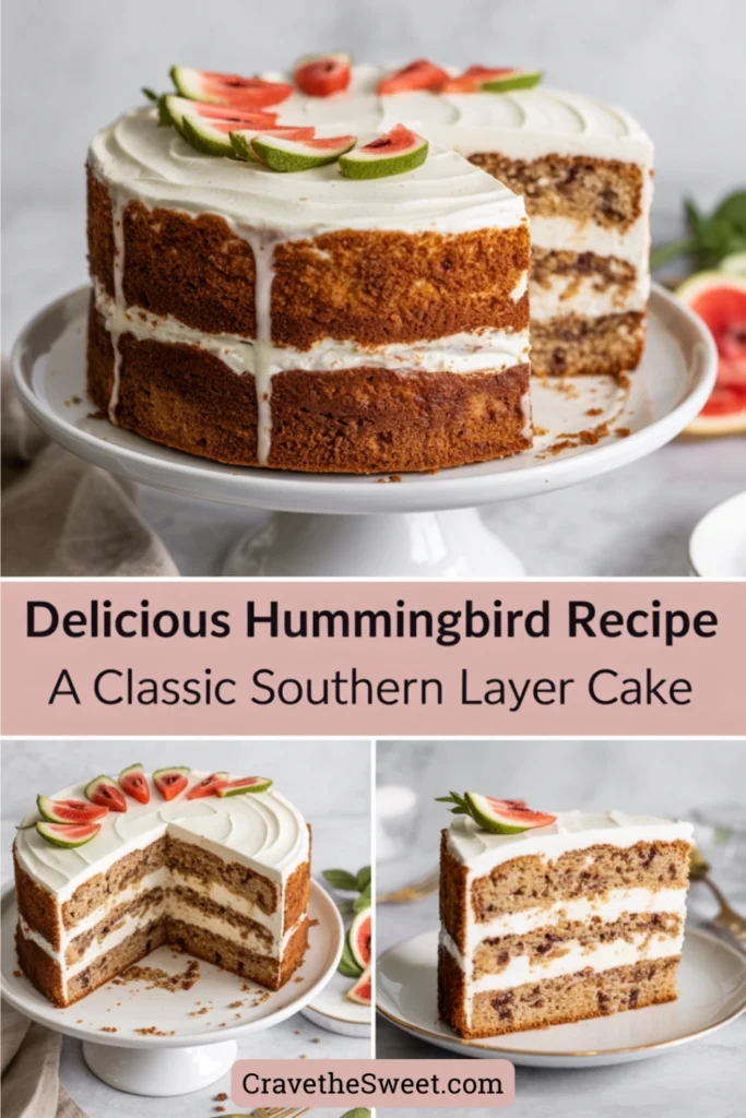 This cake is incredibly moist and flavorful with warm spices, tropical fruit, and crunchy pecans in every bite. The cream cheese frosting is tangy and rich, balancing the sweet cake perfectly. What makes this hummingbird cake recipe special is how it stays moist for days thanks to the fruit mixed into the batter. The cake comes together easily without a mixer—just stir by hand. It’s perfect for feeding a crowd since it makes three generous layers. The flavor combination is unique and memorable, making it a conversation starter at any gathering. People are always surprised by the banana-pineapple combination, which creates something greater than the sum of its parts. The cake looks impressive stacked in three layers with cream cheese frosting and chopped pecans, yet it’s surprisingly approachable for home bakers of all skill levels.