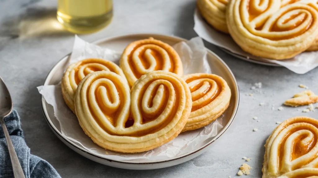 Palmiers are classic French pastry cookies made by folding puff pastry with sugar, then slicing and baking until crispy and caramelized. The name “palmier” is French for “palm tree,” referring to their distinctive palm leaf or heart shape created by the folding technique. They’re also known by various other names including “elephant ears,” “pig’s ears,” “palm leaves,” or “shoe soles” depending on the region. The beauty of palmiers lies in their simplicity—the laminated layers of puff pastry combined with sugar create incredible texture and flavor through caramelization during baking. Traditional palmiers are simply pastry and sugar, though modern variations include cinnamon, chocolate, nuts, or savory ingredients. They’re typically served with coffee or tea as an afternoon treat or dessert, though they work equally well at breakfast or brunch. The crackling, crispy texture distinguishes them from softer pastries, making them uniquely satisfying. Well-made palmiers should shatter delicately when you bite into them, releasing buttery, caramelized flavor.